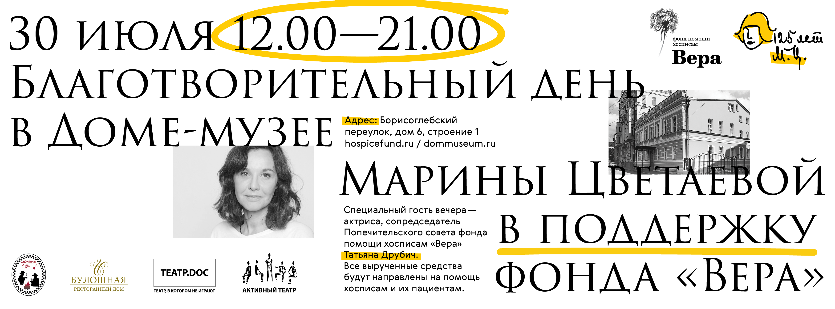 Татьяна Друбич, актриса, сопредседатель попечительского совета фонда «Вера»: «Дом-музей Марины Цветаевой уникальное место в сегодняшней Москве подлинное и откровенное, где «столько муки и такая мощь». Для фонда «Вера» большая честь и удача, что удалось собраться вместе и сделать доброе дело. Помогая хосписам, вы помогаете самым беззащитным людям – неизлечимо больным взрослым и детям – достойно жить до конца, без боли, грязи, страданий и унижения. И оставаться рядом со своими близкими».